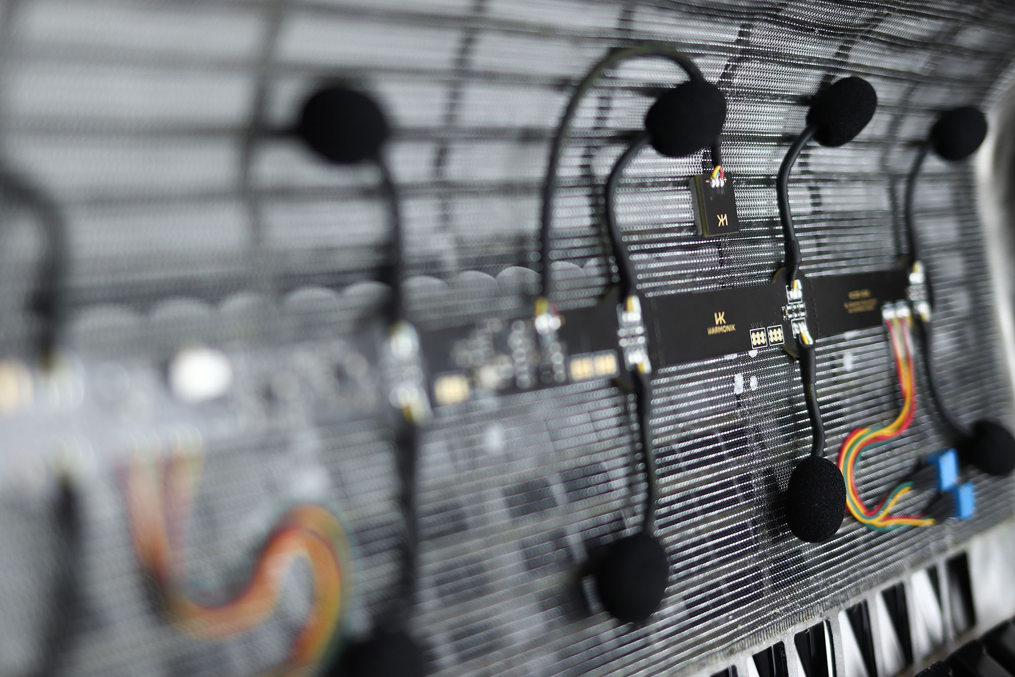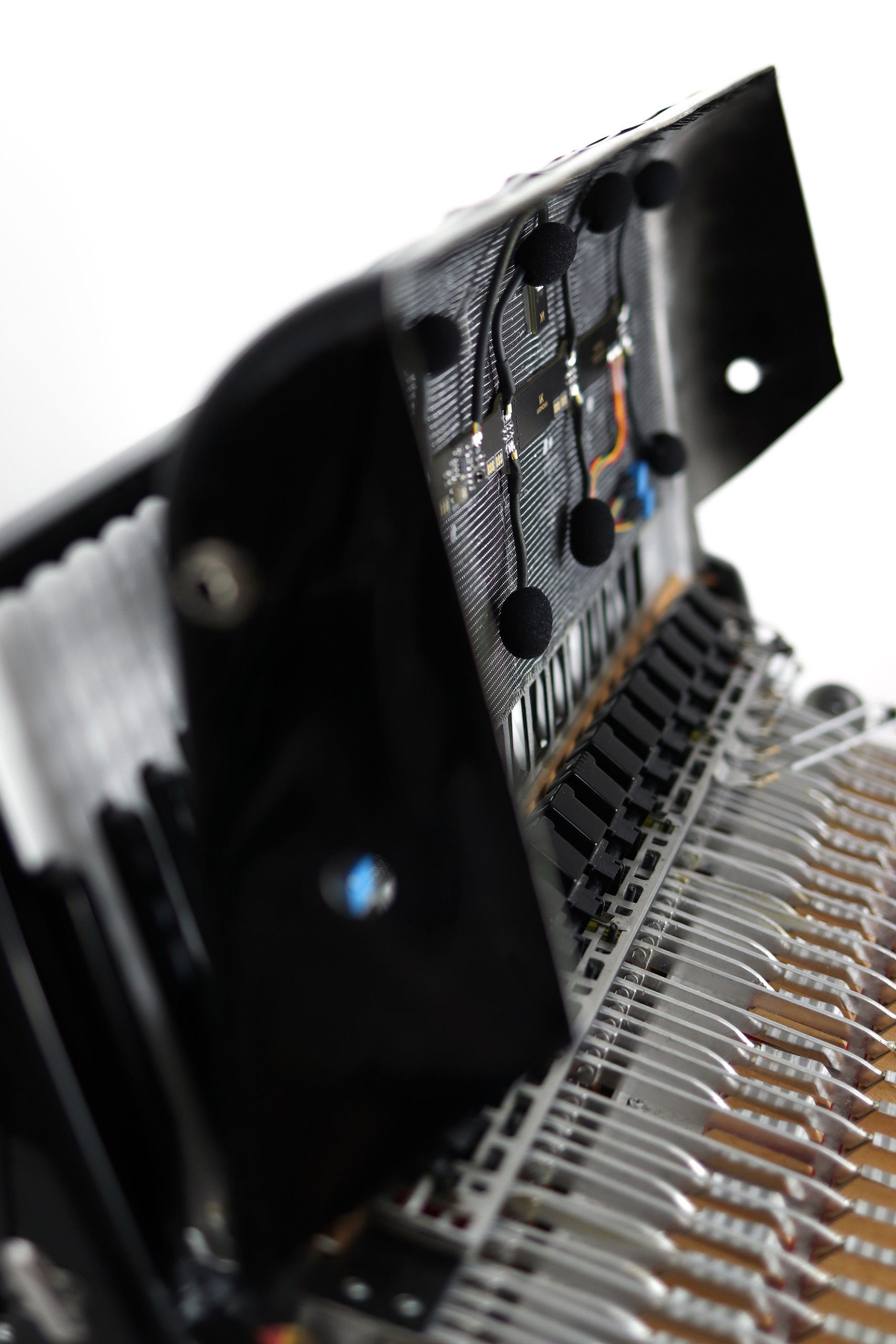 Suspensos por uma haste especial, os microfones da captação AC1001-DUAL podem ser posicionados livremente de forma a se adaptar as características construtivas de cada acordeom, desde 8 a 120 baixos.